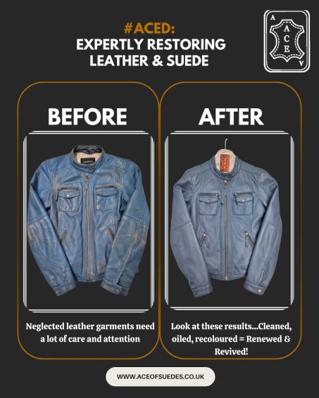 Our specialist treatment and re-oiling process will help to maintain the natural colour and texture of your leather without the risks associated with other cleaning methods. The team at Ace are also able to help restore lost colour and discolouration on a leather garment with the use of oils and leather dyes where necessary.