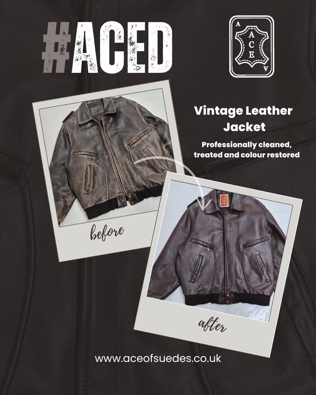 Our specialist treatment and re-oiling process will help to maintain the natural colour and texture of your leather without the risks associated with other cleaning methods. The team at Ace are also able to help restore lost colour and discolouration on a leather garment with the use of oils and leather dyes where necessary.